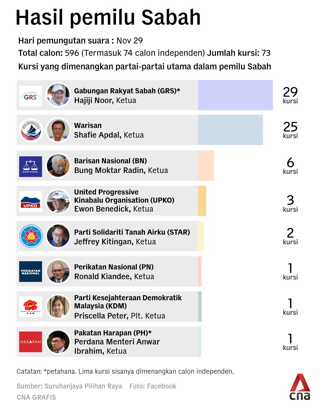 GRS akhirnya meraih 29 dari 55 kursi yang mereka perebutkan, sementara Warisan memenangkan 25 dari 73 kursi.
