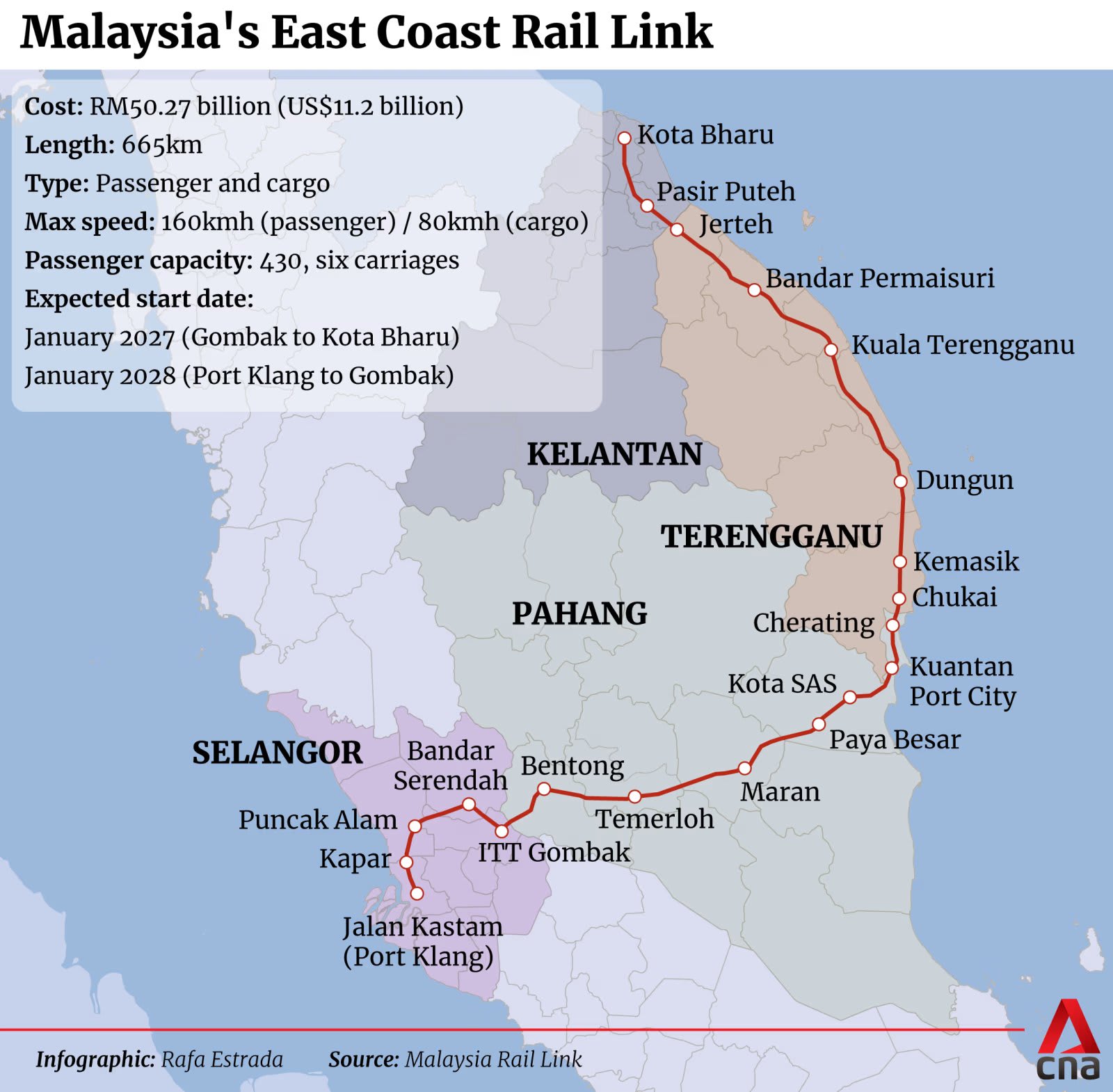 ECRL, yang diumumkan pada 2016 di bawah kepemimpinan Perdana Menteri Najib Razak, memiliki total 20 stasiun yang akan melintasi negara bagian Selangor, Pahang, Terengganu, dan Kelantan.