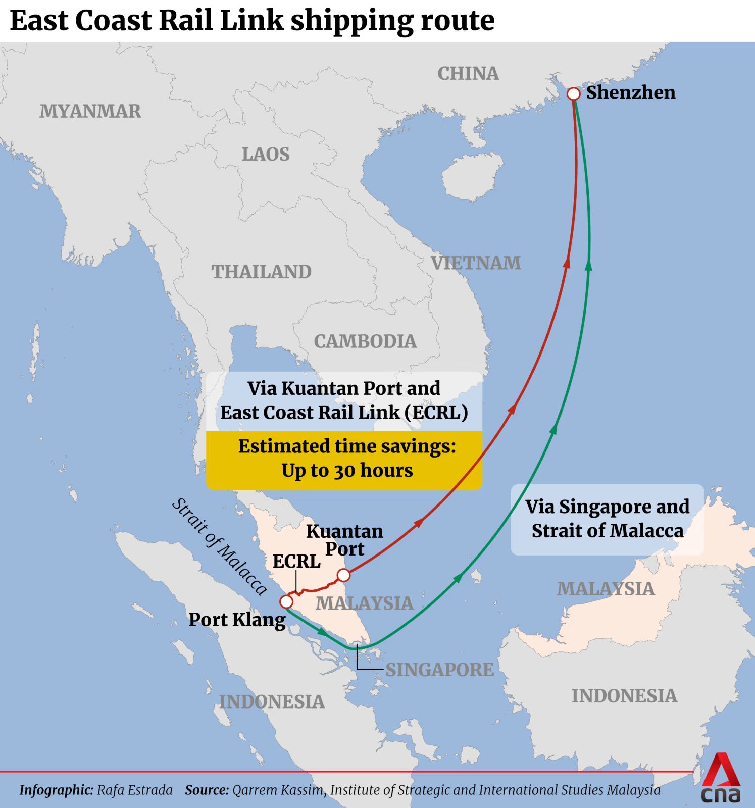 Dengan rute pengiriman dari Pelabuhan Kuantan yang terhubung langsung ke Shenzhen di China, rute laut-darat-laut baru yang ditawarkan ECRL memungkinkan eksportir untuk tidak lagi melewati Singapura dalam menjangkau pasar-pasar utama di Asia dan sekitarnya, tulis Qarrem Kassim, analis dari Institut Studi Strategis dan Internasional Malaysia dalam East Asian Policy edisi Januari/Maret 2024.