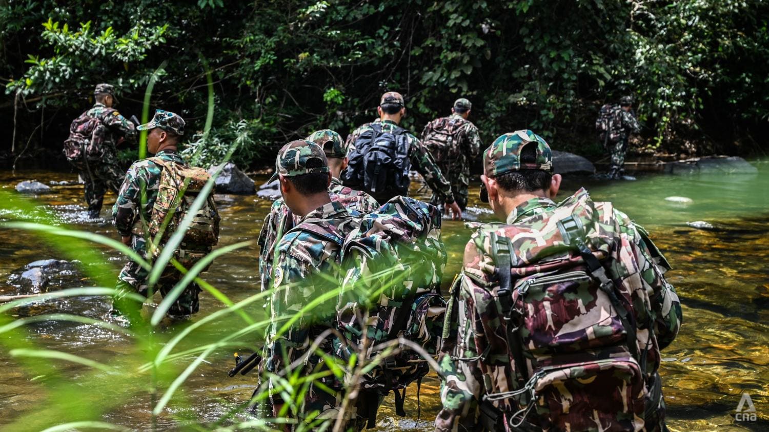 SURAT THANI, Thailand: Para jagawana bergerak dalam formasi yang rapi, selalu waspada saat berjalan menembus belantara tebal dan melintasi sungai sedalam pinggang. Hutan hujan itu riuh dengan suara burung-burung yang bersahutan, bersembunyi di rerimbunan pohon.