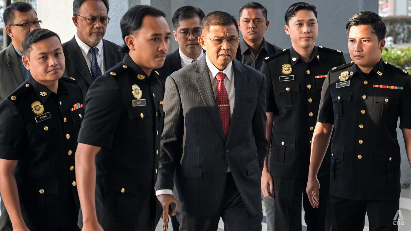 Mantan panglima angkatan bersenjata Malaysia Mohd Nizam Jaffar tiba di Kompleks Mahkamah Kuala Lumpur dengan pengawalan petugas Suruhanjaya Pencegahan Rasuah Malaysia (SPRM) pada 23 Januari 2026. (CNA/Fadza Ishak)
