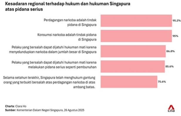 Sebagian besar responden - 85,6 persen dari mereka yang disurvei - juga mengetahui hukuman mati bagi pelaku kejahatan berat secara umum di Singapura, dengan 86,8 persen mengetahui bahwa pengedar narkoba dapat menghadapi hukuman mati.