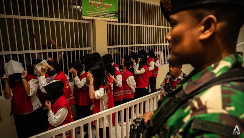 Para terdakwa dalam kasus perdagangan bayi sedang digiring keluar dari sel tahanan di Pengadilan Negeri Bandung, Jawa Barat, pada 7 April 2026. (Foto: CNA/Wisnu Agung Prasetyo)