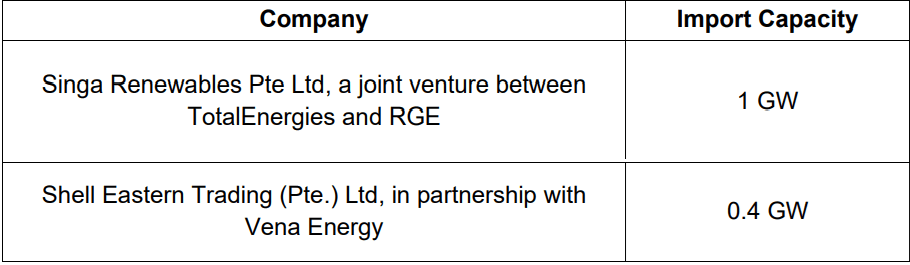 Kedua perusahaan tersebut – Singa Renewables dan Shell Eastern Trading – telah diberikan persetujuan bersyarat untuk mengimpor total 1,4 gigawatt (GW) listrik, sehingga total impor listrik dari Indonesia akan naik menjadi 3,4 GW.