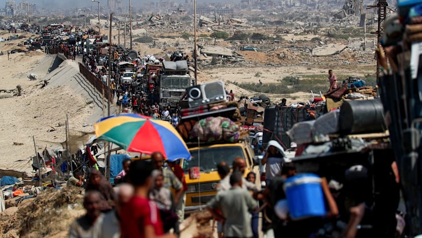 Warga Palestina yang mengungsi dari Gaza utara akibat operasi militer Israel, bergerak ke selatan setelah pasukan Israel memerintahkan penduduk Kota Gaza untuk mengungsi ke selatan, di Jalur Gaza tengah, 20 September 2025. [REUTERS/Dawoud Abu Alkas]