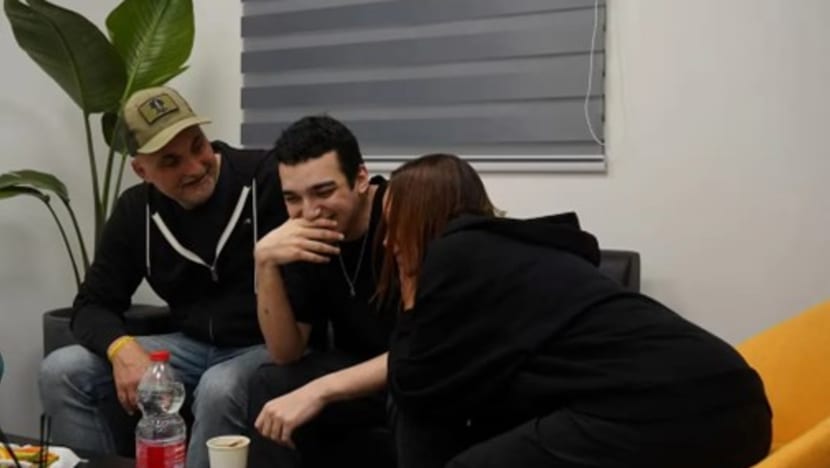 Edan Alexander, yang telah dibebaskan dari tahanan oleh Hamas, setelah diculik selama serangan mematikan pada 7 Oktober 2023 di Israel, memeluk saudaranya saat ia berkumpul kembali dengan keluarganya di Reim, Israel selatan, sebelum terbang ke Tel Aviv pada 12 Mei 2025. (GPO/Handout via REUTERS)