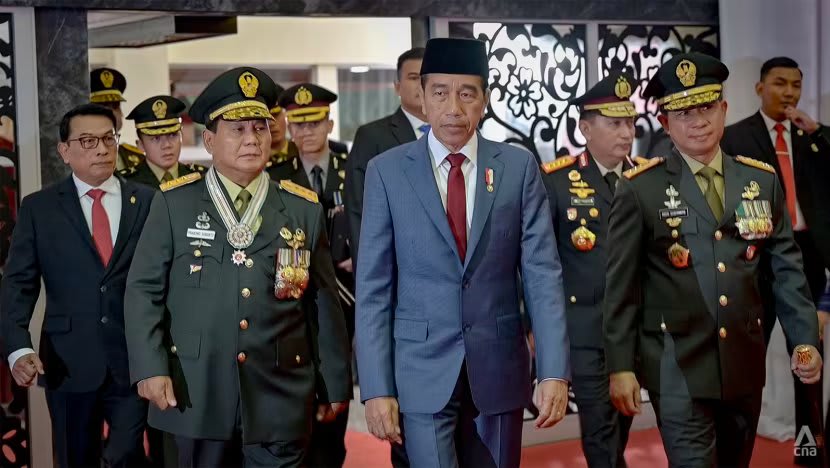 Airlangga Hartarto (kiri) memberikan sambutan sebagai ketua umum Golkar saat pendaftaran calon presiden dan wakil presiden Prabowo Subianto (kanan) dan Gibran Rakabuming Raka (tengah) pada bulan Oktober 2023. (Foto: CNA/Danang Wisanggeni)