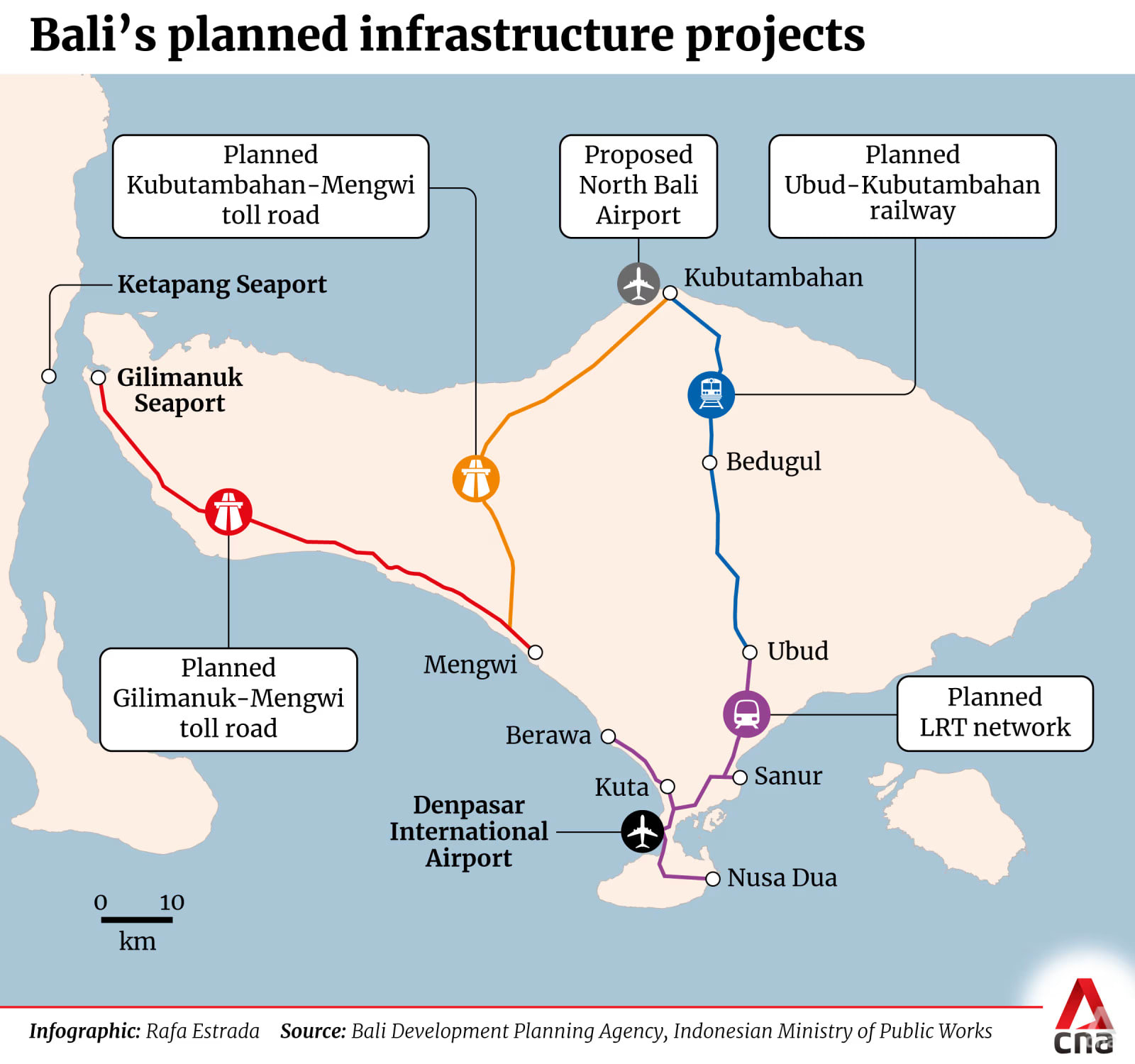 Kementerian Pekerjaan Umum seharusnya membangun jalan tol sepanjang 96,8km yang menghubungkan Mengwi dan Pelabuhan Gilimanuk di ujung barat pulau Bali. Pelabuhan ini merupakan gerbang utama bagi para turis yang memasuki Bali dari Jawa melalui jalur laut.