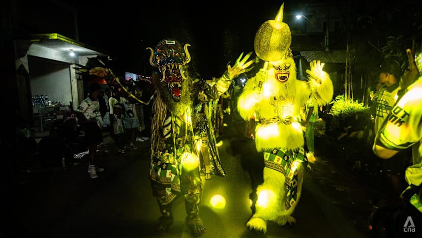 Seorang pria berkostum menari mengikuti musik dari truk sound horeg dalam parade di Desa Jeru, Malang, Jawa Timur, 30 Agustus 2025. (Foto: CNA/Wisnu Agung Prasetyo)