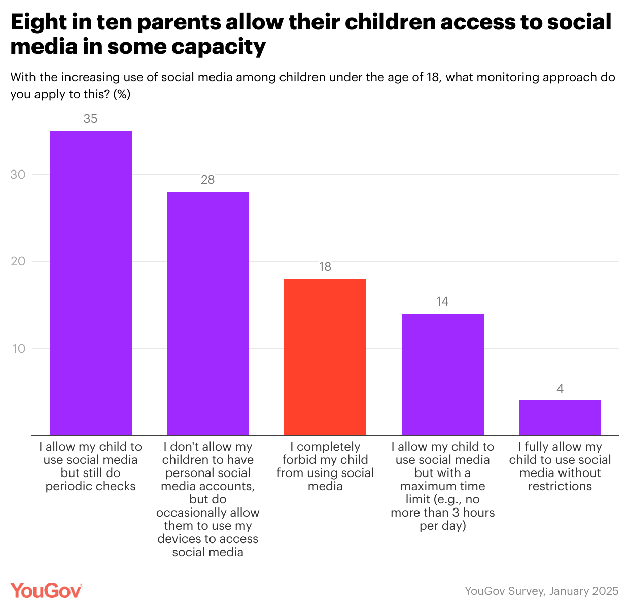 Namun, 82 persen orangtua tetap mengizinkan anak mereka menggunakan medsos dengan berbagai bentuk pengawasan. Sebanyak 34 persen memantau aktivitas anak secara berkala, 28 persen membiarkan anak mengakses medsos melalui perangkat mereka sendiri, dan 14 persen menerapkan batasan waktu penggunaan. Hanya 18 persen yang melarang anak-anak mereka menggunakan media sosial sepenuhnya.