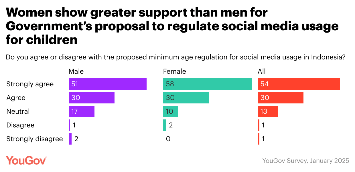 Mayoritas warga Indonesia mendukung dibuatnya peraturan pemerintah tentang usia minimum pengguna media sosial, namun setengah dari peserta survei YouGov meragukan atau netral terhadap efektivitasnya.
