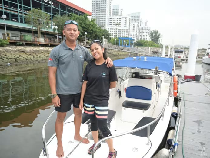 Nurhuda Saad (kanan) bersama suaminya, Adzman Abdul Rahman, di atas perahu motor yang mereka beli setelah menjual tempat tinggal dan mobil demi merintis Get Hooked SG. (Foto: CNA/Syamil Sapari)