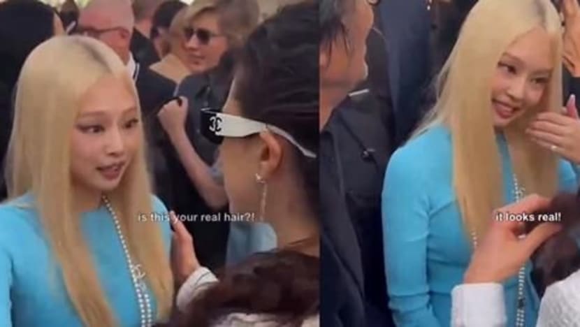 Aktris Margaret Qualley menyentuh rambut Jennie BLACKPINK yang baru diwarnai pirang sambil bertanya, "Ini rambut asli?" dikutip dari South China Morning Post.