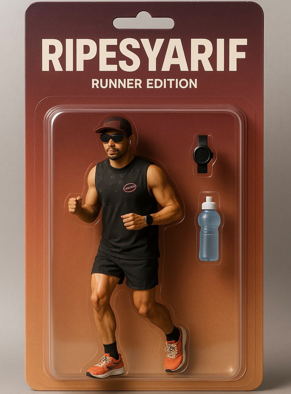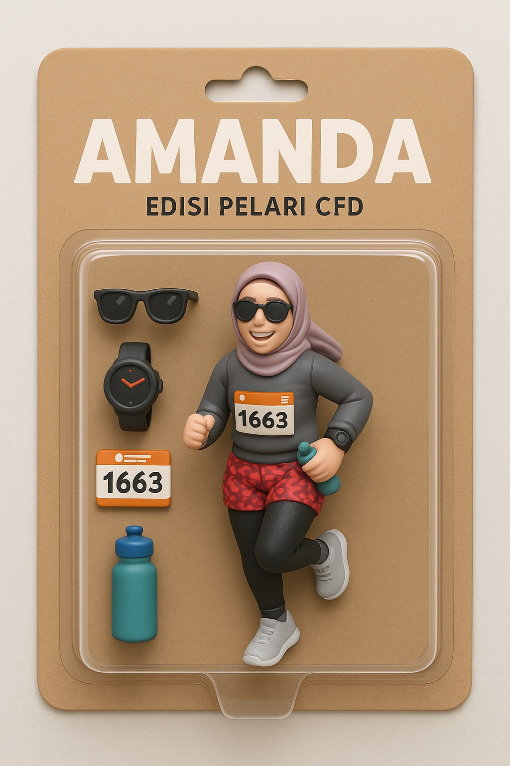 "Bikin gambar figur mainan 3D action figure, seolah-olah sedang dipajang dalam kemasan transparan dalam toko mainan blister packaging. Figurnya sesuai foto dengan gaya sedang berlari dan tersenyum ramah. Di bagian atas kemasan, ada tulisan besar nama saya [AMANDA] sebagai highlight. Kemudian di bawah nama saya, ada tulisan edisi foto [EDISI PELARI CFD]. Tambahkan beberapa item pendukung seperti yang ada di foto. Buat dengan style minimalis, keren dan lucu pakai warna dasar karton."