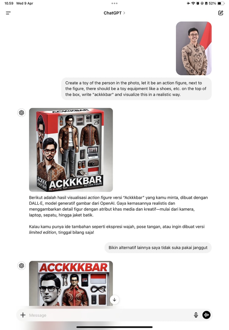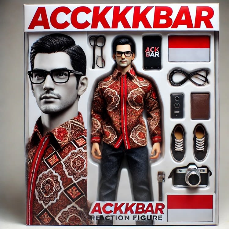 Berikut prompt dalam Bahasa Inggris yang yang ia ketikkan ke ChatGPT: "Create a toy of the person in the photo, let it be an action figure, next to the figure, there should be a toy equipment like a shoes, etc. on the top of the box, write ‘ackkkbar’ and visualize this in a realistic way." (Buat mainan semacam action figure dari orang yang ada di dalam foto, di samping gambar, harus ada peralatan mainan seperti sepatu, dll. Di bagian atas kotak, tulis 'ackkkbar' dan visualisasikan dengan cara yang realistis.)