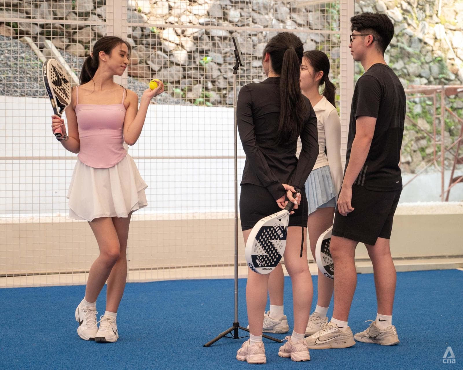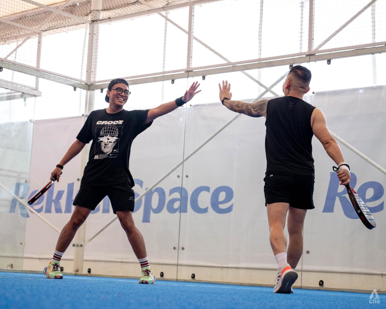 Tito Triputra (kanan) bermain padel bersama rekannya Arien Karina (kiri) di Jakarta, 2 Agustus 2025. (Foto: CNA/Ridhwan Siregar)