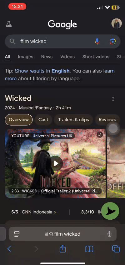 Ketik "Wicked movie" dalam Bahasa Inggris, atau "film Wicked" untuk pencarian Bahasa Indonesia, maka kamu akan disambut dengan daftar hasil pencarian yang disertai sebuah topi penyihir kecil muncul seperti tombol mengambang di layar.