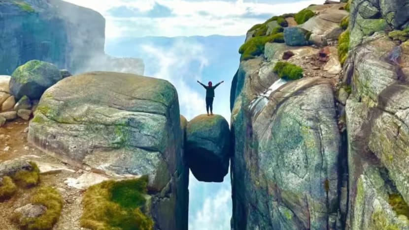 Mendekati usia kehamilan tujuh bulan, Fiona Lee mendaki bebatuan menakjubkan di Norwegia, salah satunya Kjeragbolten, bongkahan batu besar yang terkenal di Gunung Kjerag, dengan ketinggian hampir 1.000 dari teluk ngarai di bawahnya. (Foto: Fiona Lee)