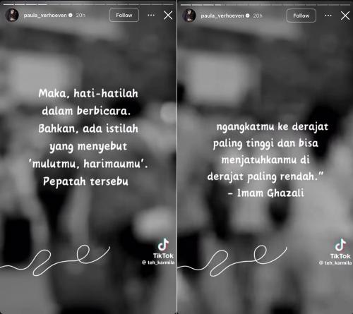 “Maka hati-hatilah dalam berbicara. Bahkan ada pepatah yang mengatakan ‘mulutmu, harimaumu.’ Ini mengingatkan kita semua untuk selalu menjaga lisan,” tulis video yang dibagikan Paula, seperti yang dilihat CNA pada Kamis (23/1).
