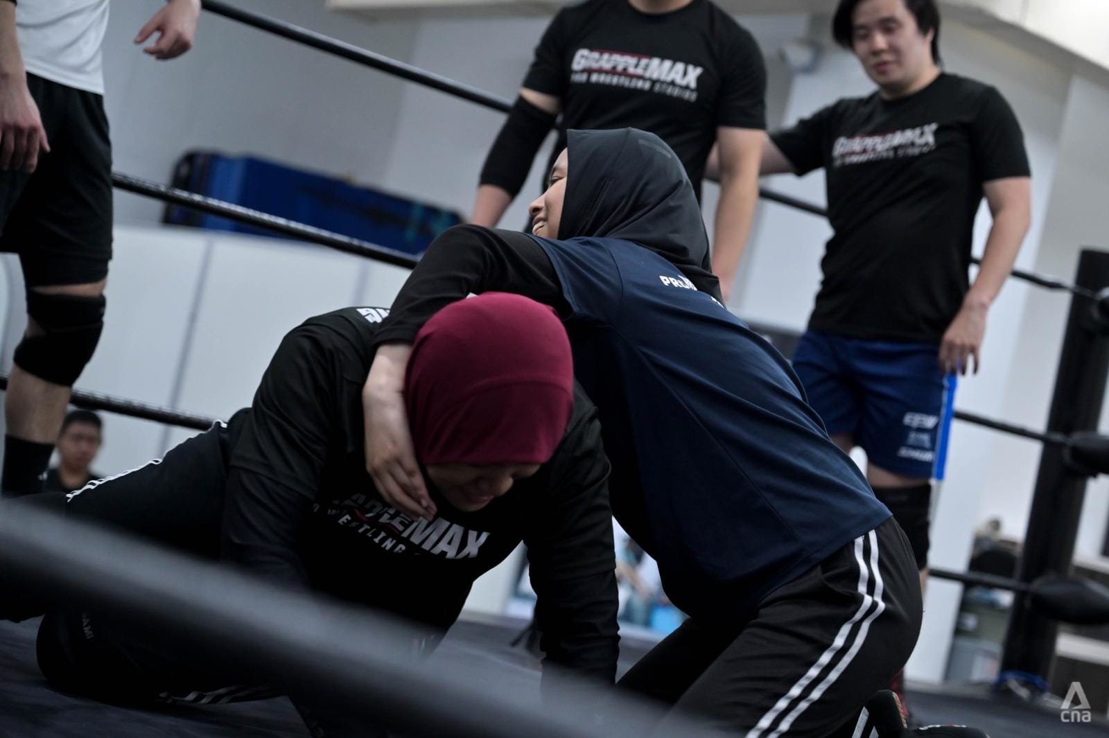 Nadirah dan Nadiah juga mendapat bimbingan dari sosok perintis di olahraga ini: Maisarah Abu Samah, yang dikenal para penggemar sebagai *Sarah Coldheart*, pegulat berhijab pertama di Singapura.